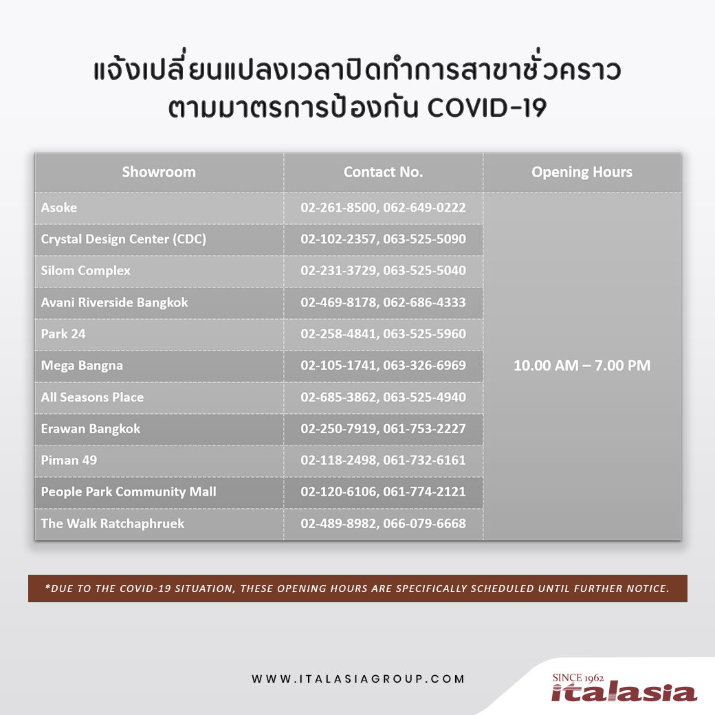 อิตาเลเซียขอแจ้งเปลี่ยนแปลงเวลาปิดให้บริการของแต่ละสาขาทั้งในกรุงเทพฯ และนนทบุรีเป็นการชั่วคราว ตามมาตรการการป้องกัน COVID-19