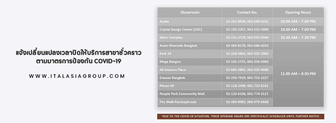อิตาเลเซียขอแจ้งเปลี่ยนแปลงเวลาปิดให้บริการของแต่ละสาขาทั้งในกรุงเทพฯ และนนทบุรีเป็นการชั่วคราว ตามมาตรการการป้องกัน COVID-19